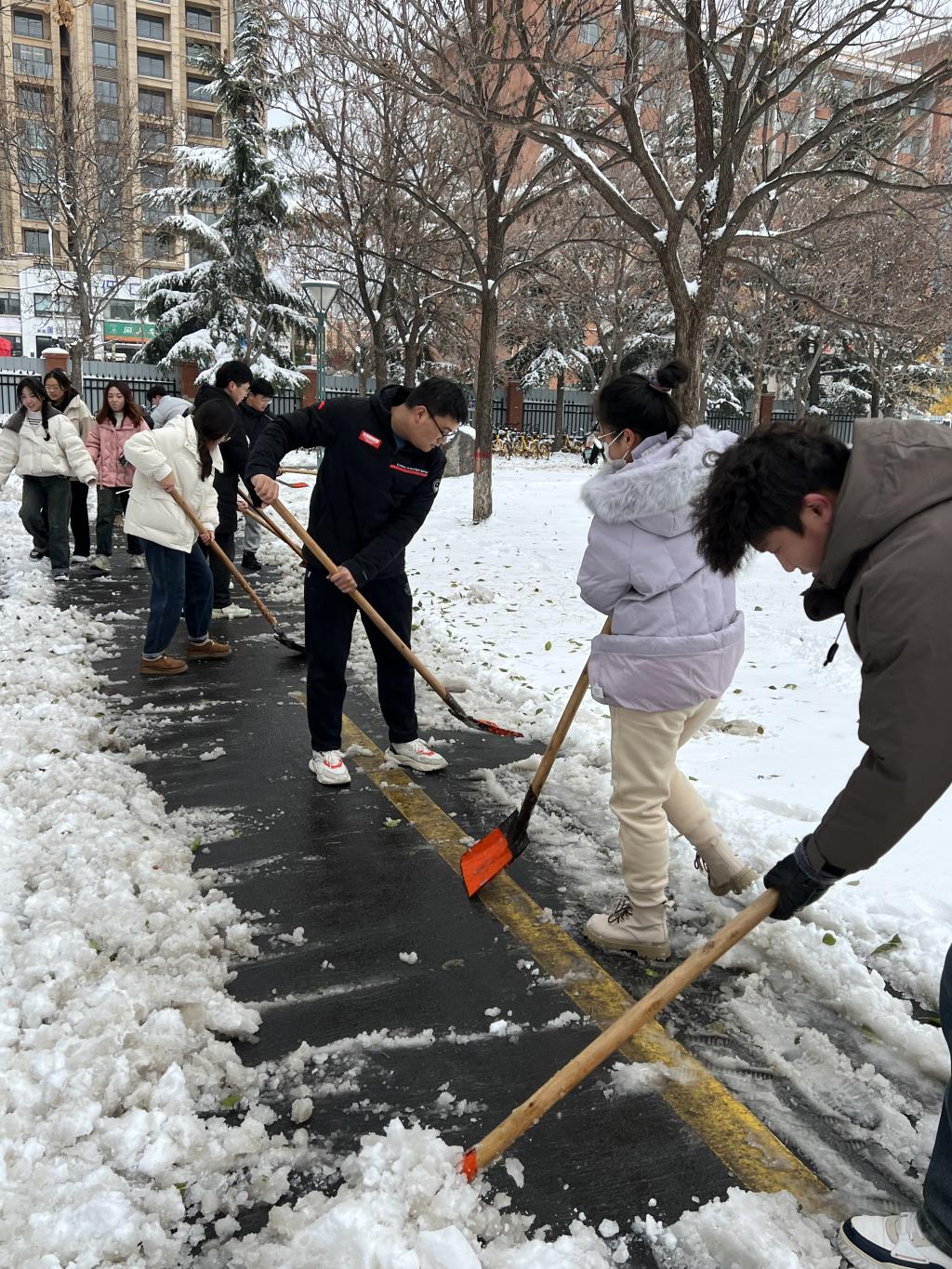 在支部书记马亚琼和张佳慧的带领下,党员同志们热挥舞铁锹、扬起雪铲,积极投身到这场温暖冬日的扫雪行动中。十余名志愿者团结协作,默契配合,有的负责铲雪,有的负责扬雪,经过两个多小时的奋战,将北门至一号教学楼周围的四条主干道清扫出通道,供行人和车辆安全通行。虽然鞋子湿了,手上磨破了皮,但党员同志张炎说道,看到道路露出本来的样貌,看到路边堆积小雪山,看到行人不用再小心翼翼地走路,心里还是很有成就感的。