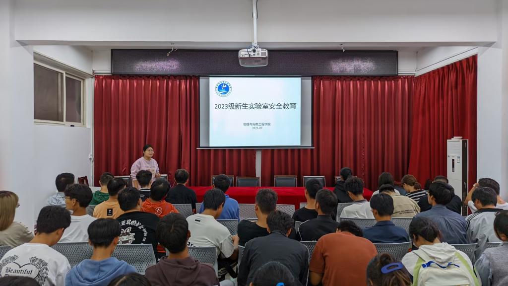 于9月27日在2号实验楼进行了2023级新生实验室安全培训。培训由物理实验中心副主任袁佩玲老师进行,党总支副书记刘自范、学工办主任马亚琼老师参与。