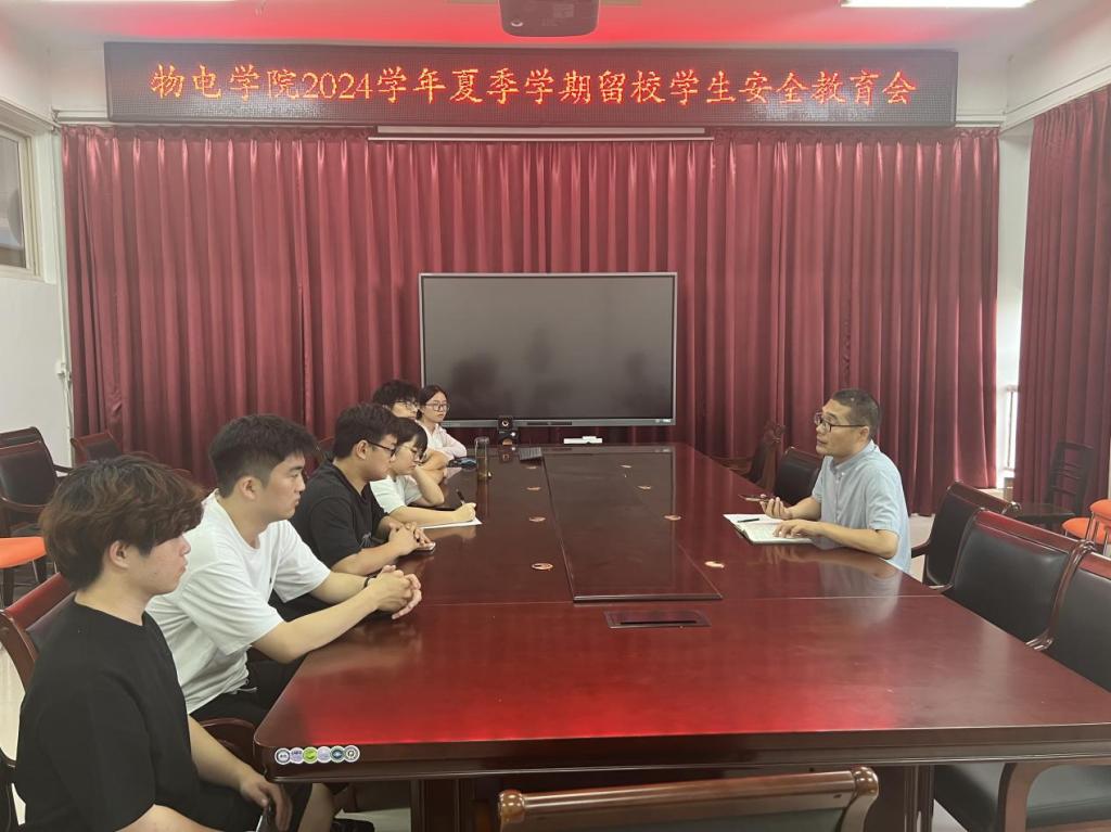 于7月12日在2号实验楼3楼会议室召开夏季学期安全教育会议。本次会议由学院副书记刘自范主持,学工办马亚琼老师和全体留校同学参加。