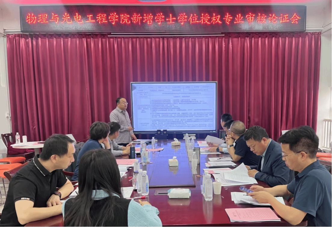 在学院会议室召开光电信息科学与工程专业学士学位授予专业授权审核论证会。论证会的专家组由郑州大学物理学院/材料物理教育部重点实验室李新建教授、华北水利水电大学电子工程学院许磊教授、郑州轻工业大学电子信息学院冯学超教授、郑州师范学院物理与电子工程学院唐亚楠教授、河南工程学院理学院李海东教授5位校外专家组成。