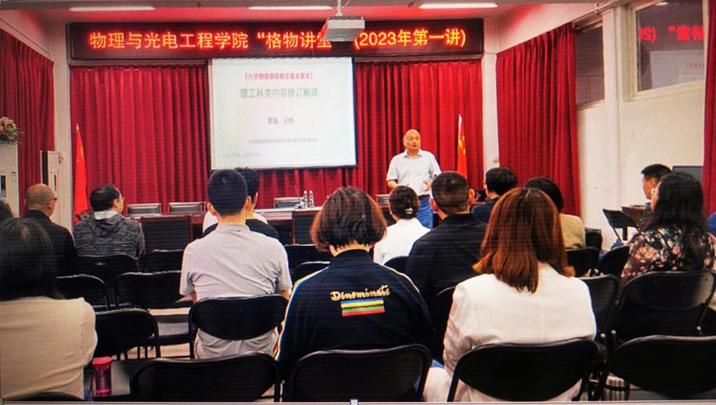 530日,教育部高等学校大学物理课程教学指导委员会副主任委员、中南地区大学物理教学工作委员会主任委员、河南省特聘教授,河南大学贾瑜教授受邀做客 男同性恋 “格物讲堂”,并作开堂第一讲:“《大学物理课程基本要求》理工科类内容修订解读”。报告会由院党总支书记、院长方莉俐教授主持,学院近40名教师聆听了报告。