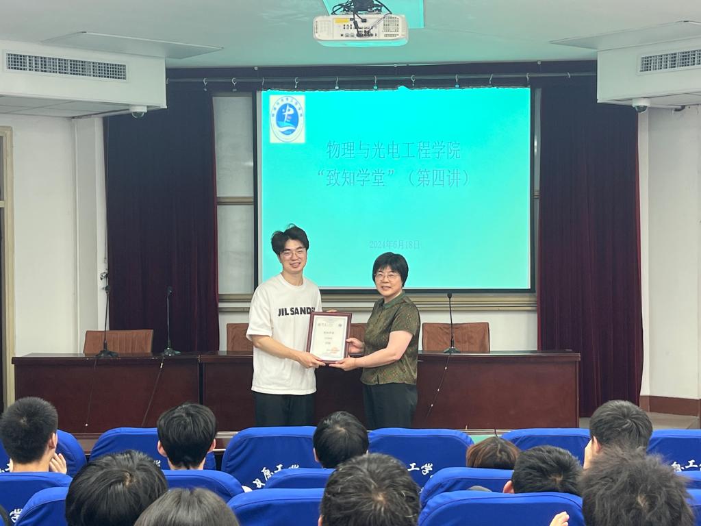 方莉俐代表学院向付邵春、郝彦植、刘韩三位优秀研究生毕业生颁发了“致知学堂”主讲嘉宾证书。